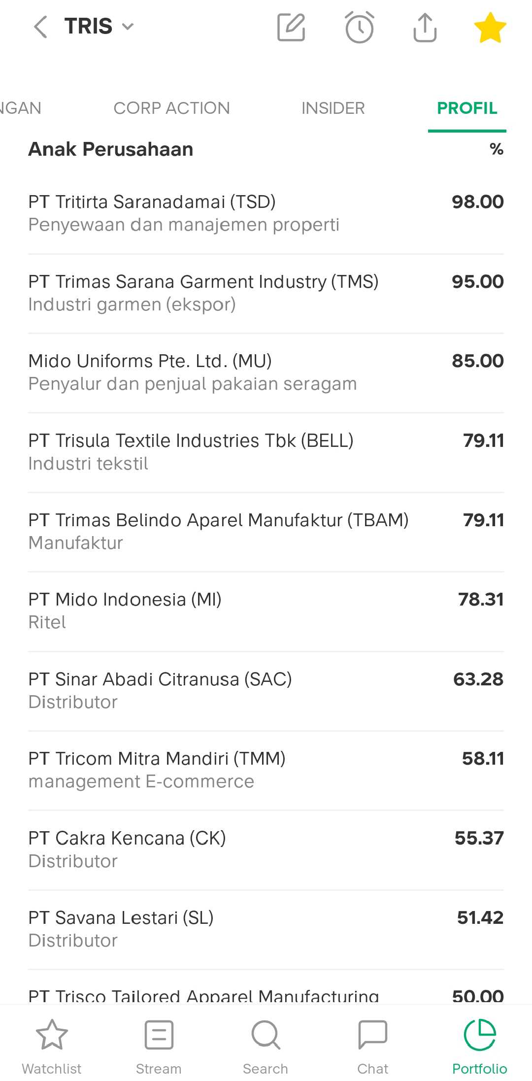 Mayoritas anak usaha TRISULA dikuasai 70–99%.