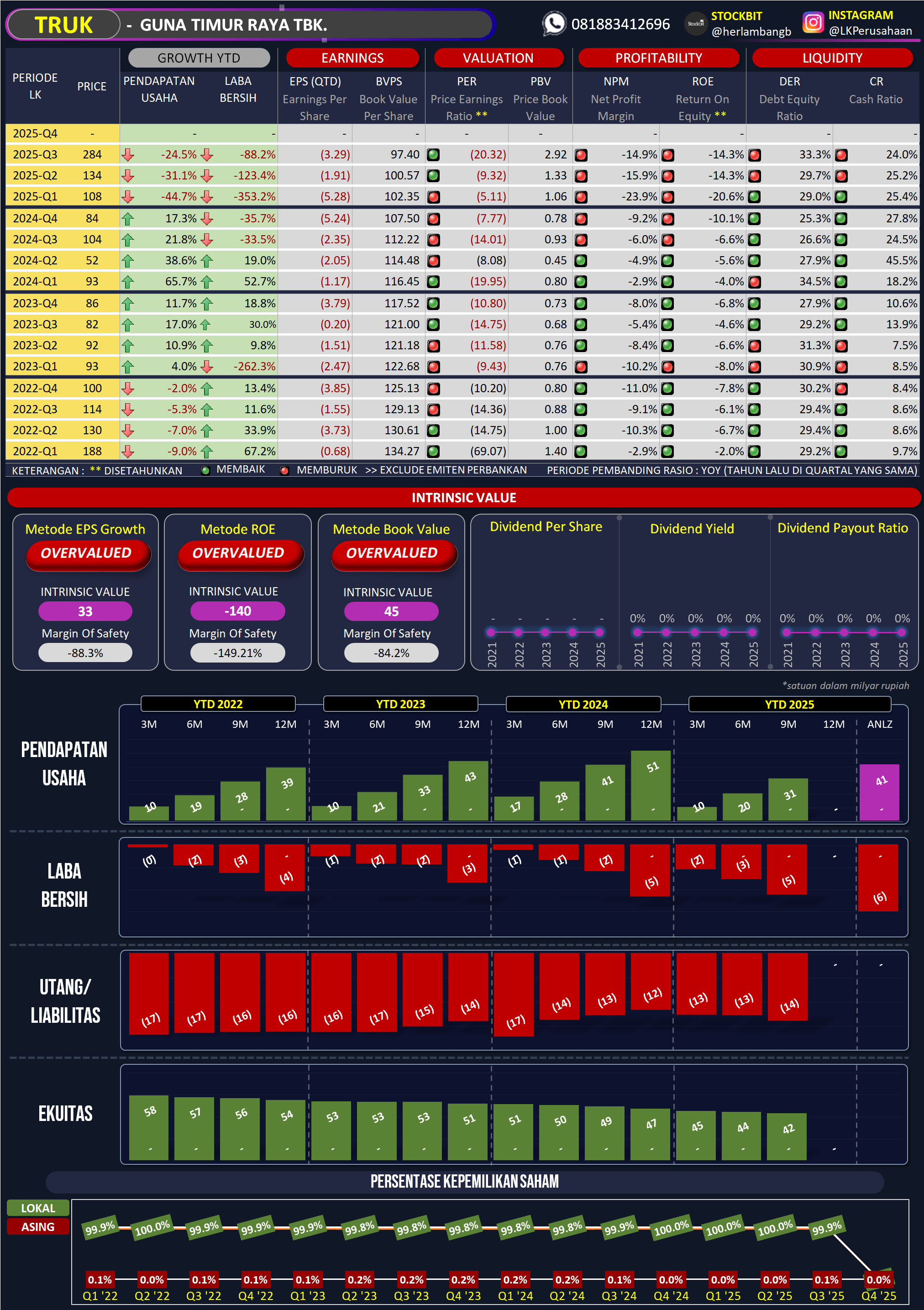 PT Guna Timur Raya Tbk (TRUK) Perusahaan yang menjalankan bisnis di bidang jasa pengurusan transportasi (freight forwarding). Perusahaan terutamanya bergerak dalam penyediaan jasa transaportasi produk kimia. Perusahaan sudah memiliki lebih dari 100 truk dalam menjalankan aktivitas operasi usahanya. TRUK menyediakan jasa terintegerasi dari transportasi, distribusi, serta pergudangan dari hulu ke hilir.