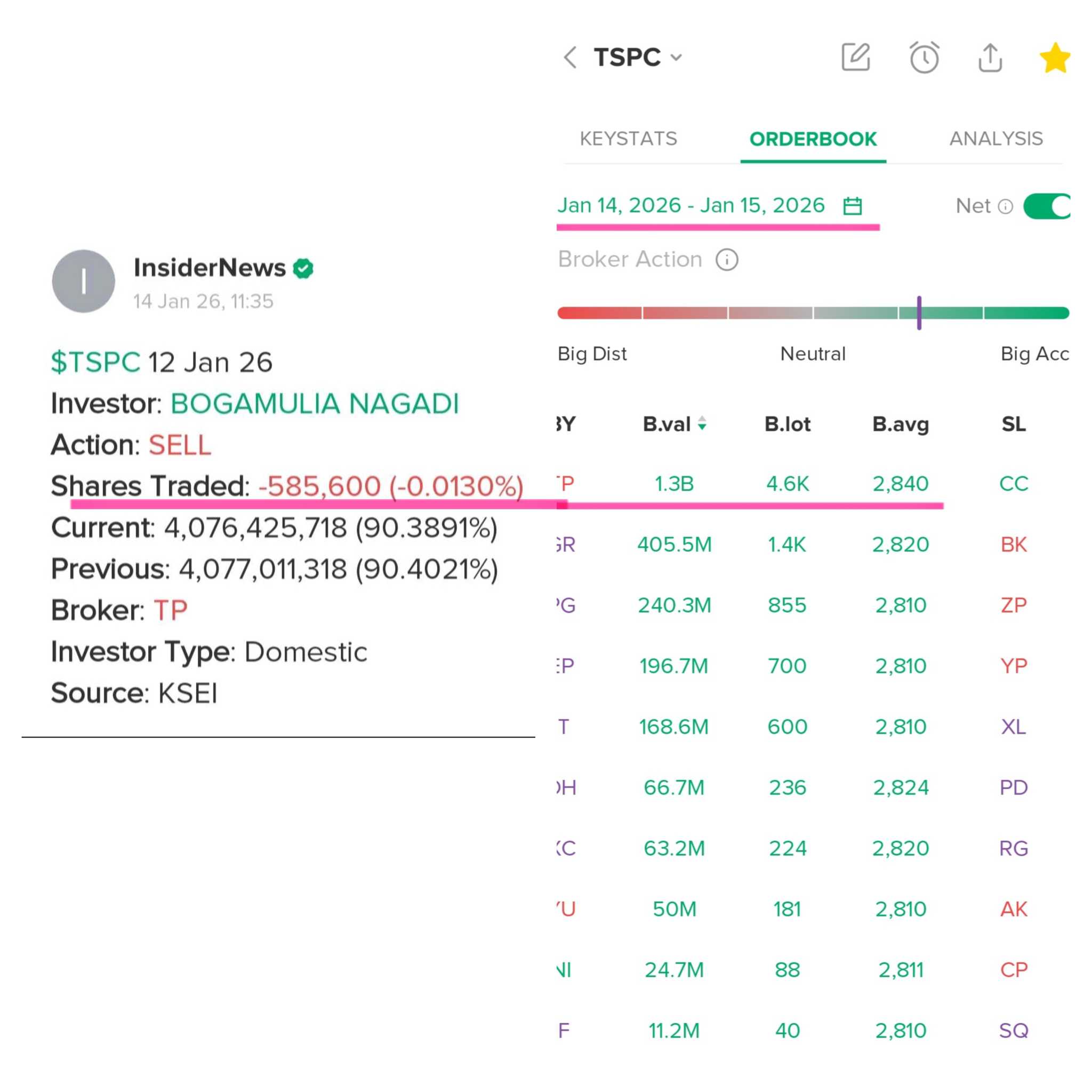 Trx 08 Jan 2026 (Settlement 12 Jan 2026) Owner sold 5,856 Lot @ Rp 3,056