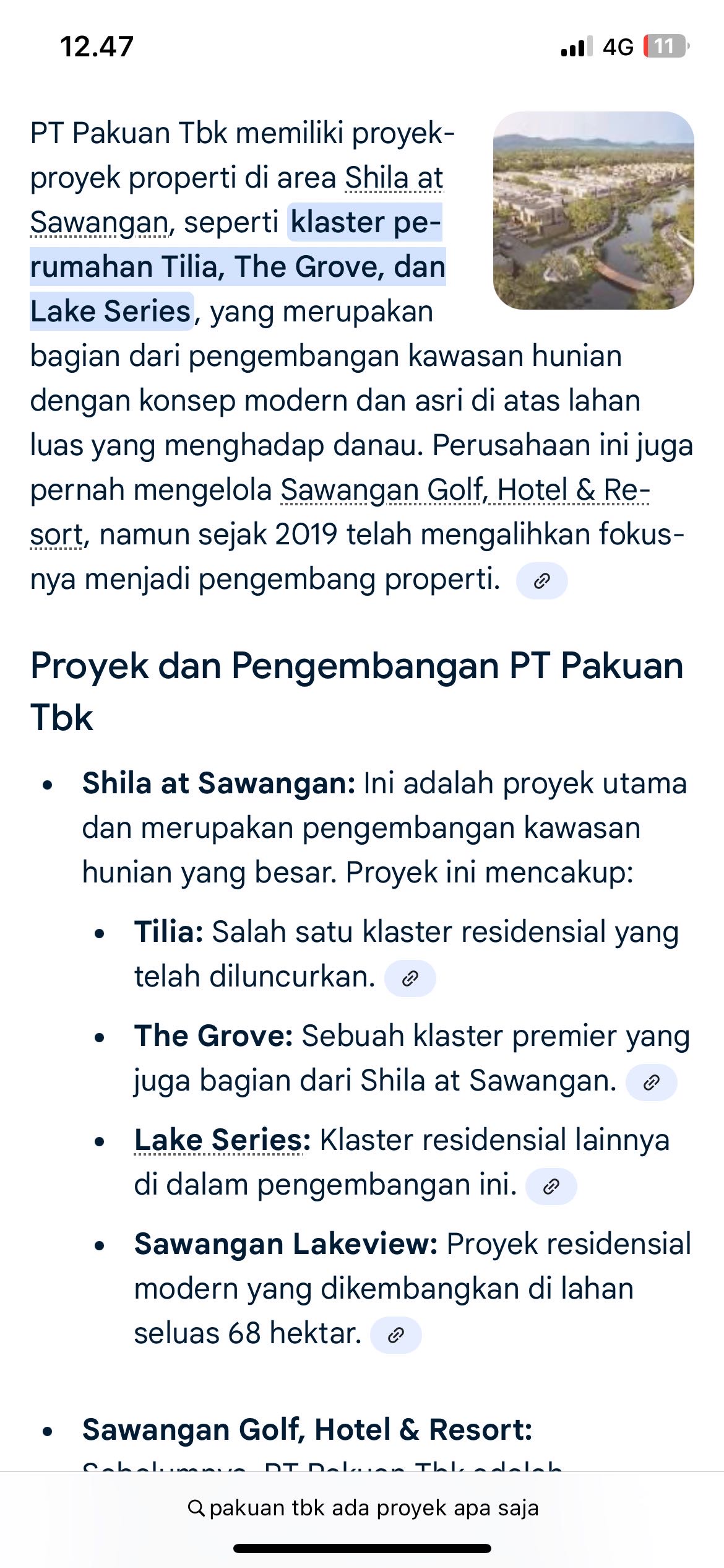 PT Pakuan Tbk didirikan sejak tahun 1971, merupakan manajemen pengelola lapangan golf 18 holes berstandar internasional, hotel & resort, restoran, serta kolam renang yang kini disebut sebagai Sawangan Golf, Hotel & Resort. Dalam rencana strategis Perseroan guna mengembangkan potensi aset, manajemen mempunyai gagasan sebagai pengembang properti (developer) di sektor residensial dan komersial. Gagasan proyek tersebut diberi nama Sawangan Lake View, sebuah proyek pengembangan hunian dan area komersial bagi masyarakat Sawangan yang berlokasi di Jalan Raya Muchtar, Sawangan, Kota Depok.