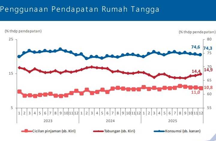 Sementara itu, porsi penggunaan pendapatan untuk konsumsi sedikit menurun, namun disertai peningkatan porsi tabungan dan penurunan cicilan pinjaman.
