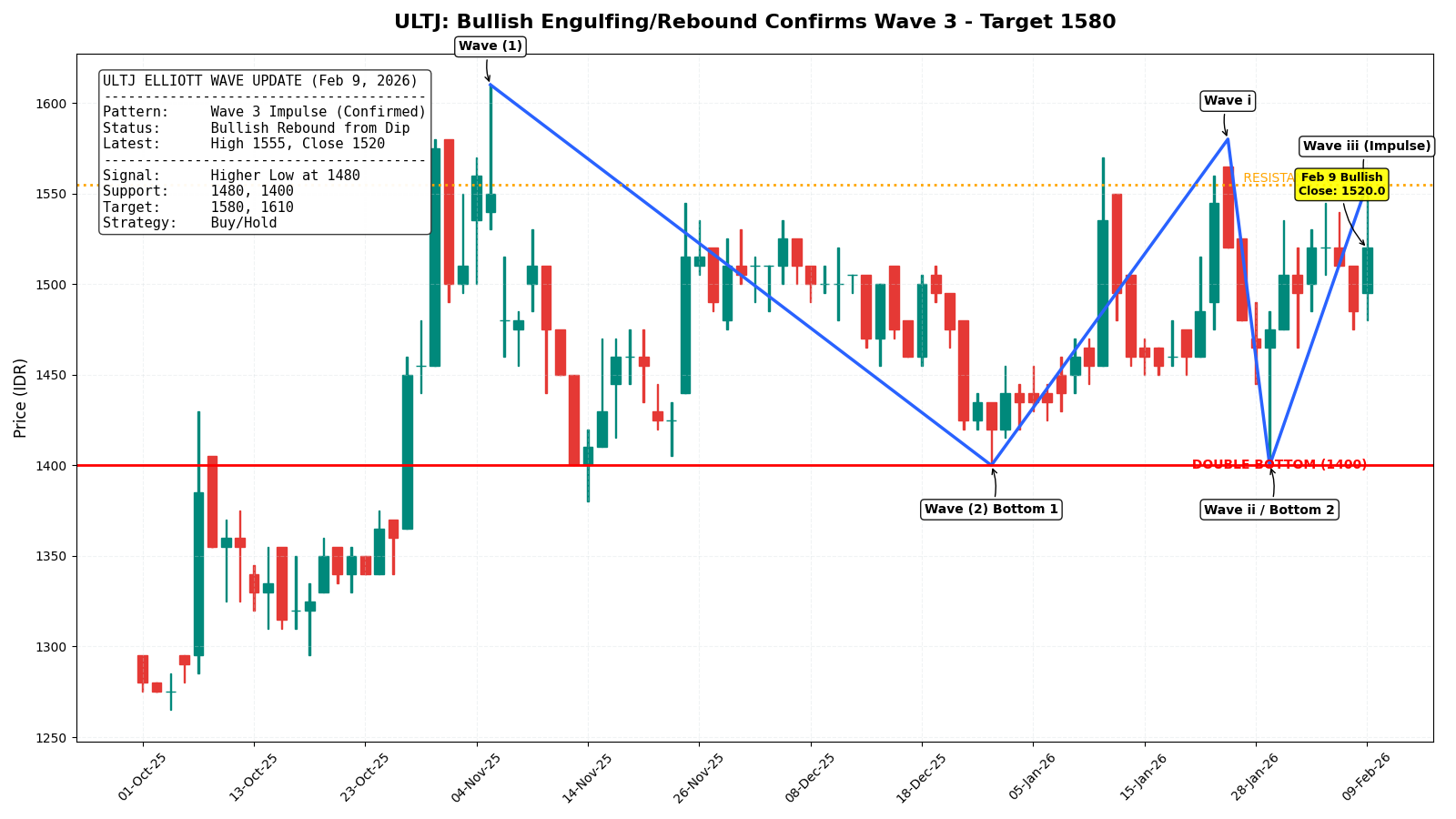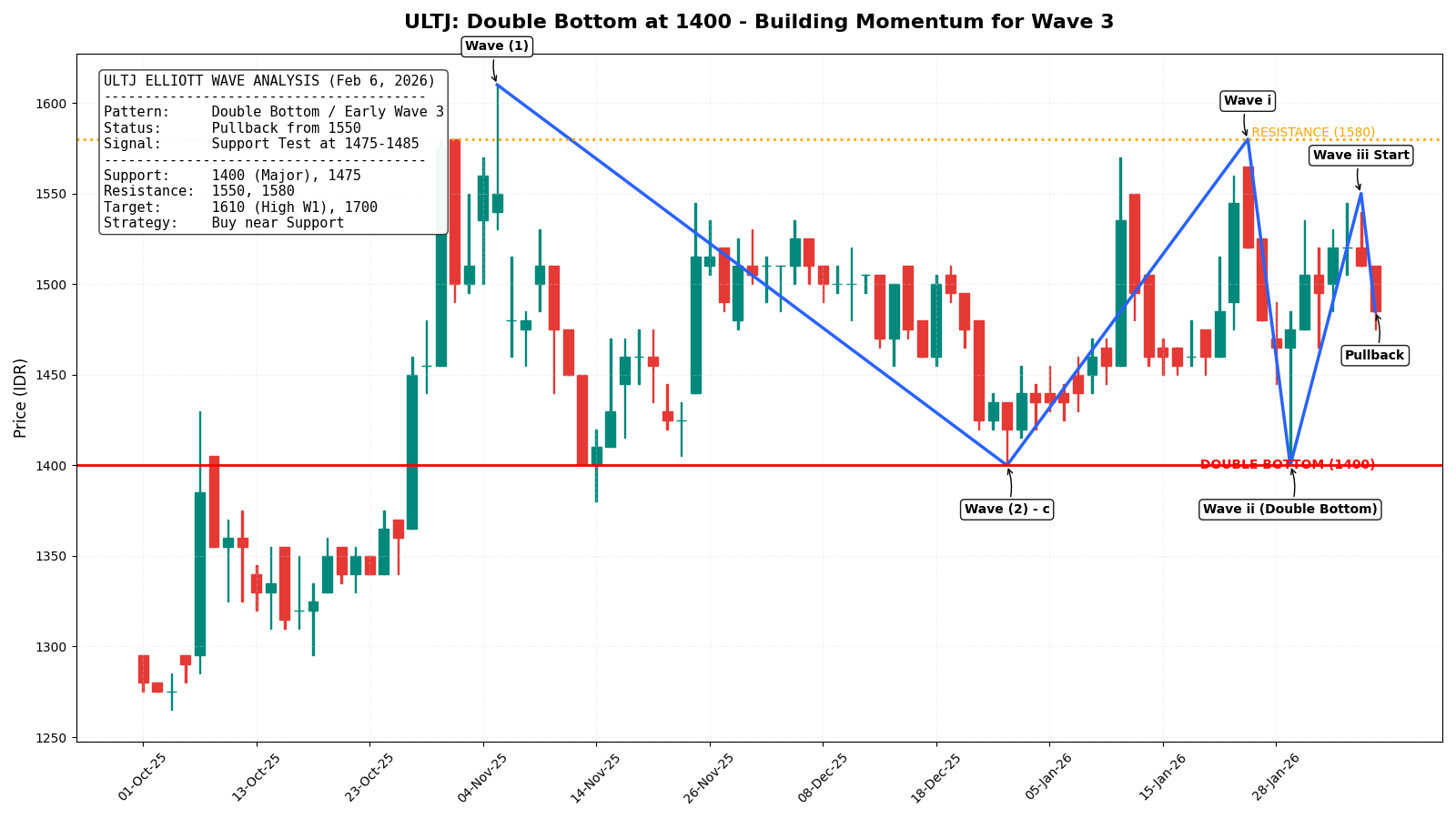 Kesimpulan: ULTJ bergerak sangat rapi sesuai skenario bullish. Pola Higher High dan Higher Low yang terbentuk hari ini memvalidasi tren naik menuju 1580.