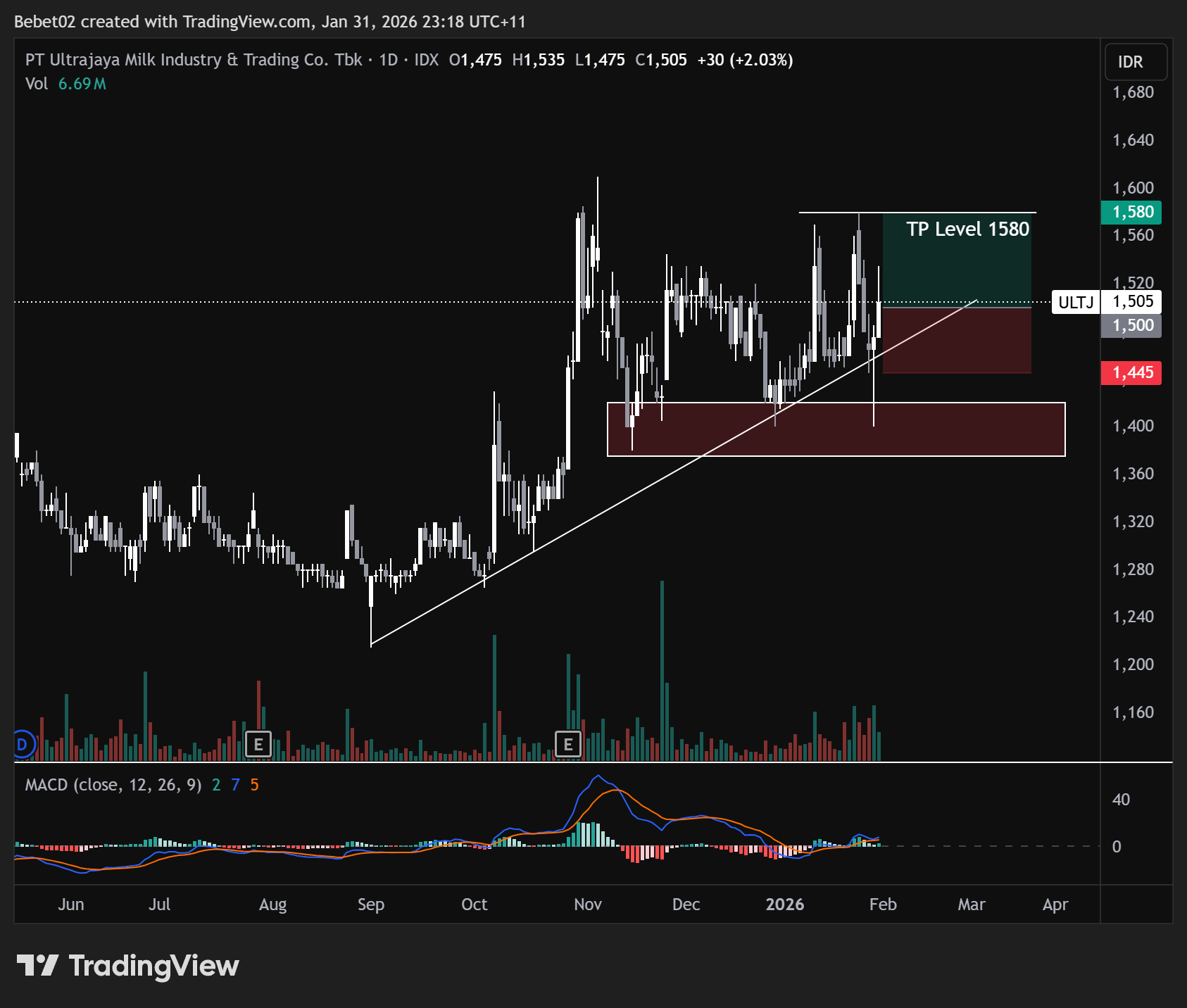 - Selama ULTJ bertahan di atas support kunci 1.370, peluang swing ke area 1.500–1.560 masih terbuka.