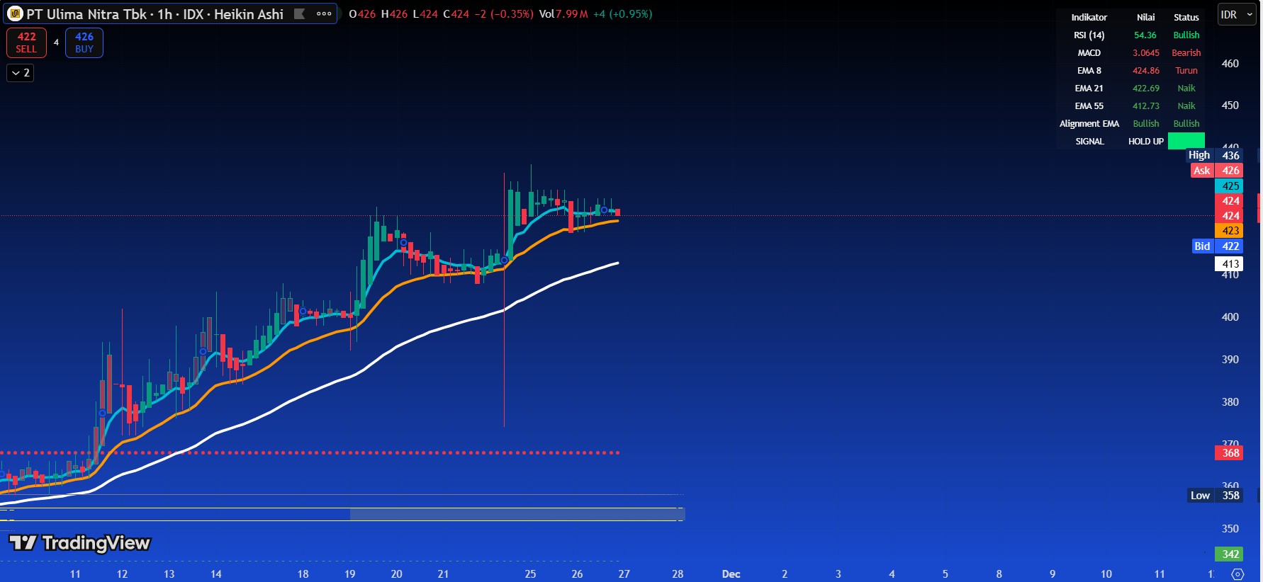 Harga turun dari puncak, namun belum menghancurkan tren utama — EMA 55 masih naik dan harga masih bergerak di atasnya. Saat ini, UNIQ berada di zona kritis 422–424, area yang potensial untuk rebound atau breakdown.
