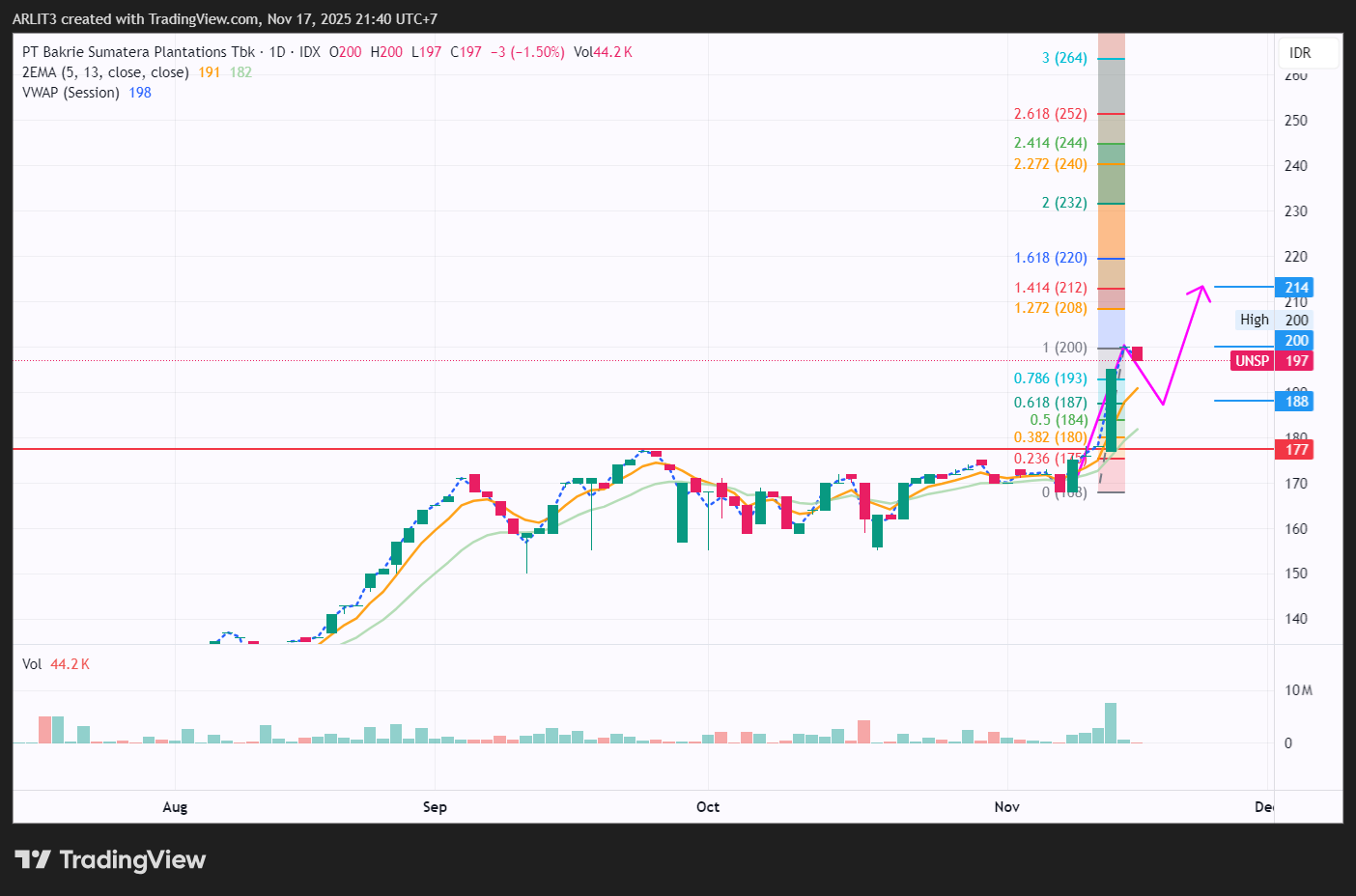 The results of the 2025 Kadin National Leadership Meeting (Rapimnas) focused on strengthening the micro-economy, expanding employment opportunities, and developing human resources, with several key points: an 8% economic growth target, support for food security, strengthening the creative industry, increasing investment efficiency (ICOR), and strategies for facing digital transformation. What about the movement of the Bakhrie family's shares? Is it the right time to buy or sell? $BUMI, $UNSP, and $ELTY