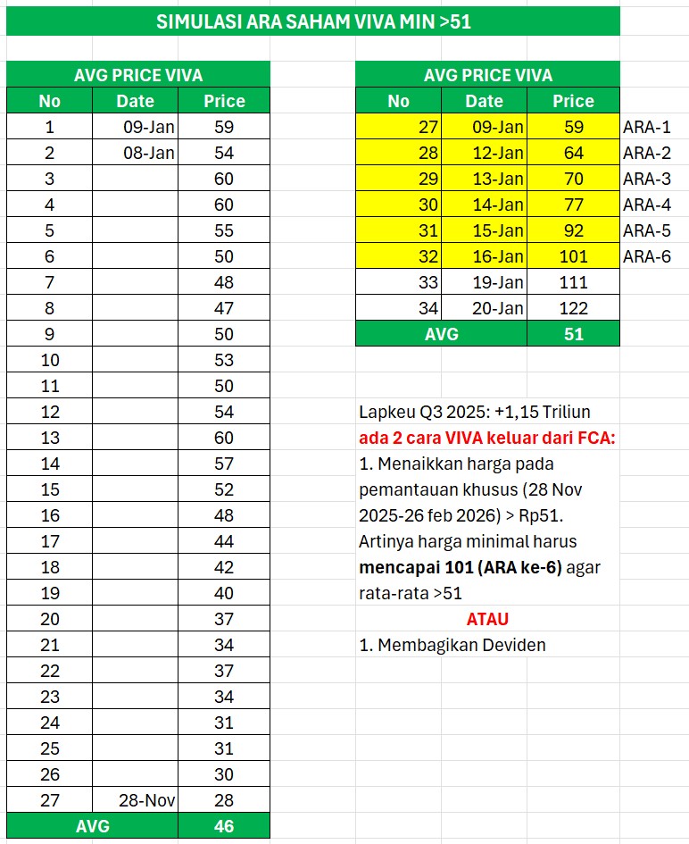 $VIVA, Lapkeu Q3 2025: +1,15 Triliun. Ada 2 cara VIVA keluar dari FCA: 1) Menaikkan harga pada periode pemantauan khusus (28 Nov 2025-26 feb 2026) > Rp51. Artinya harga minimal harus mencapai 101 (ARA ke-6) agar rata-rata >51; atau 2) Membagikan Deviden. tag saudara: $BNBR $ELTY