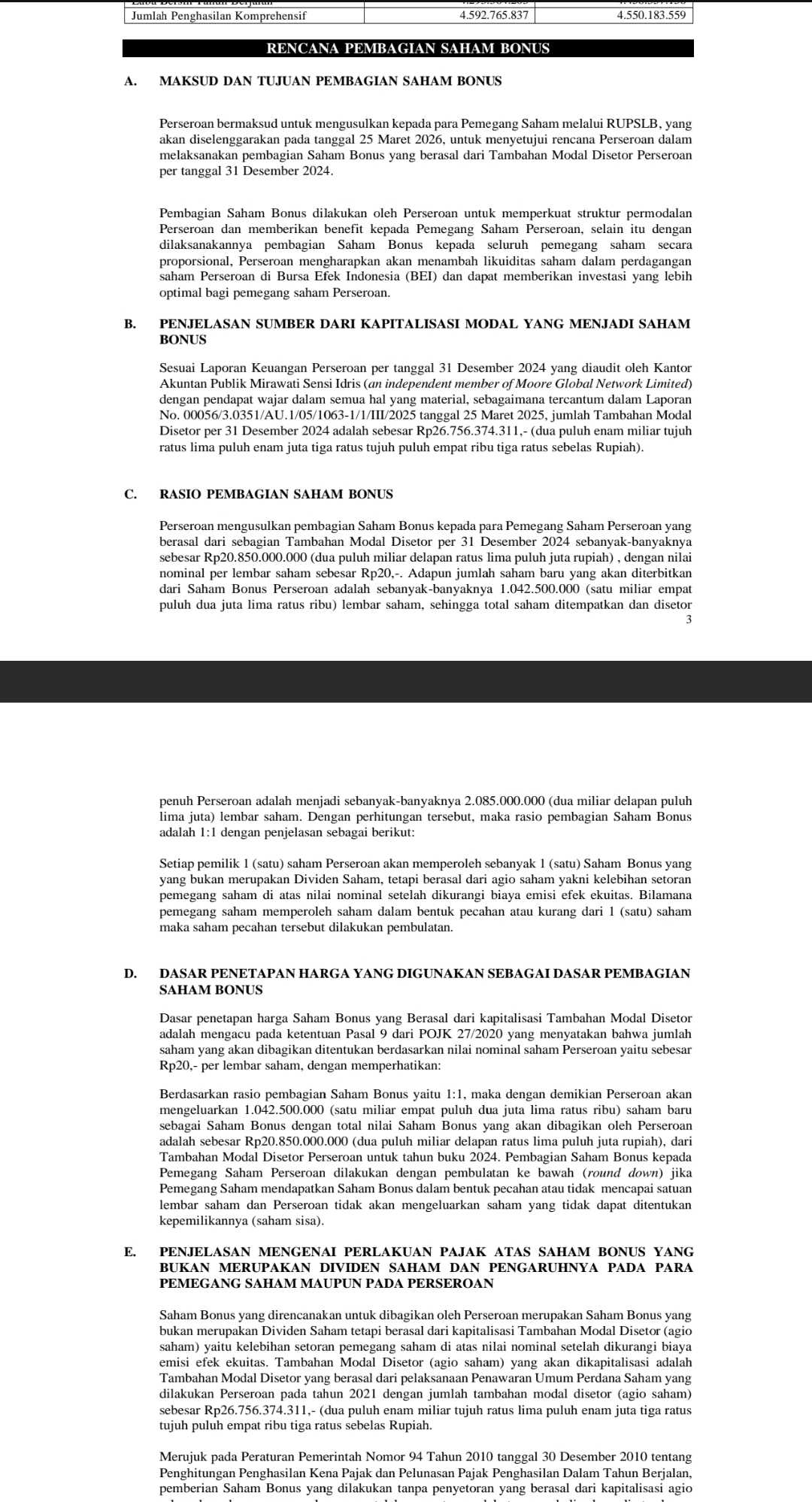 Total saham bonus yang akan dibagikan mencapai 1.042.500.00 saham dengan rasio 1:1. Di mana satu saham lama akan memperoleh satu saham baru (dengan pembulatan ke bawah).