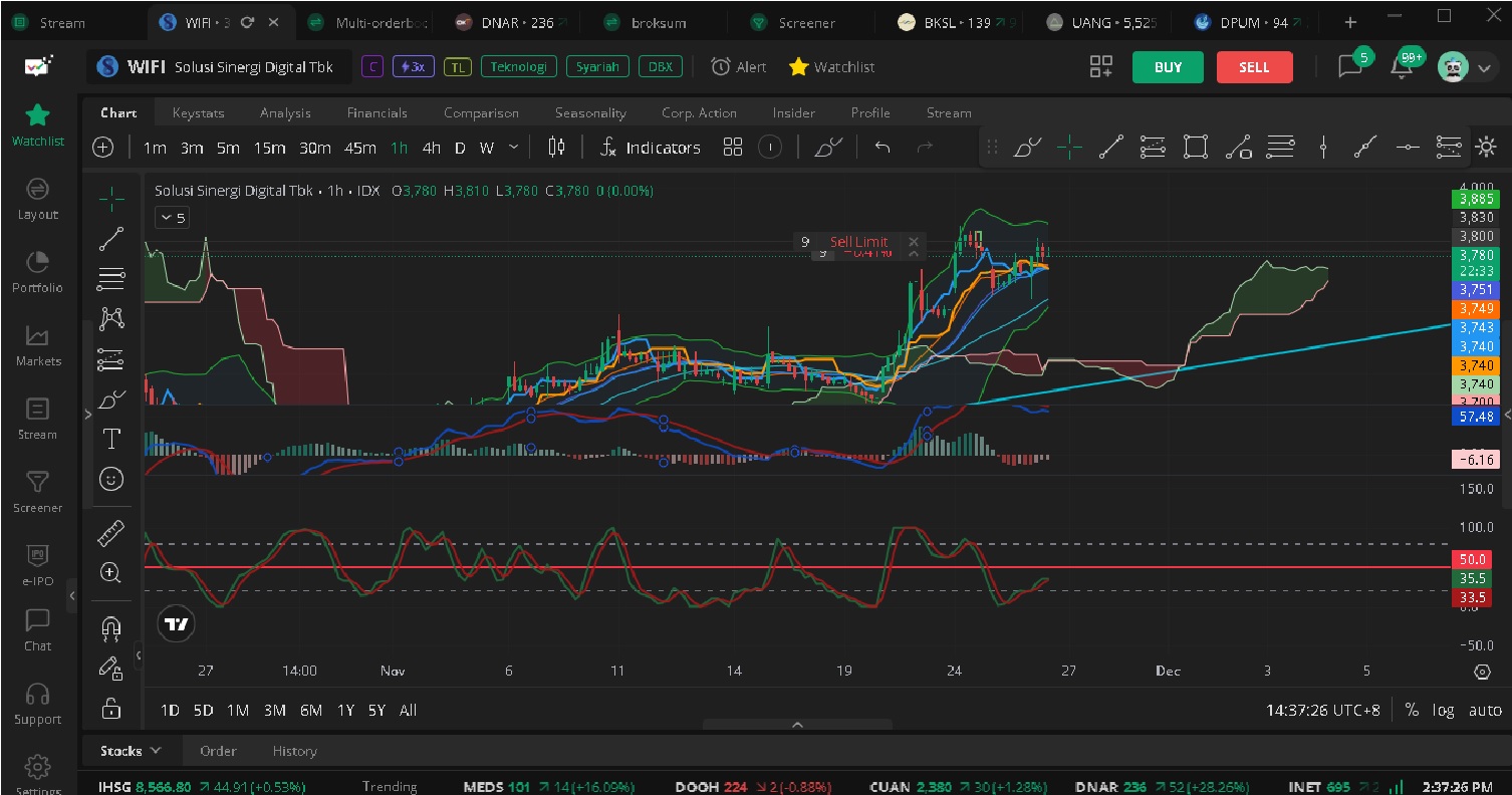 $WIFI Terpantau hari ini mengalami kenaikan ditandai garis alligator yg masih di jalur uptrend nya hijau merah biru. Untuk macd juga menarik berada di warna pink semoga bisa secepatnya ganti ke macd hijau. Untuk target terdekat nya ada di resistance 3880.