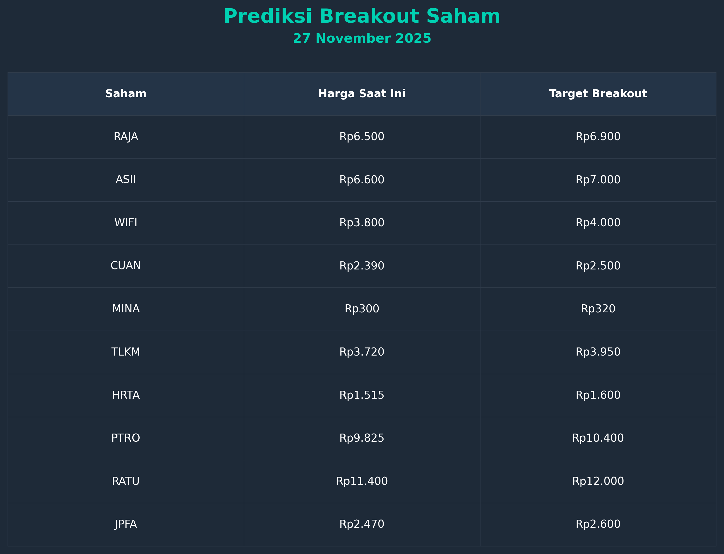 Jika harga tidak mencapai Entry Ideal dan malah menembus di atas TP1 (Rp4.000) dengan volume besar (Breakout Valid), maka strategi Buy on Breakout dapat dipertimbangkan, namun dengan risiko yang lebih tinggi.