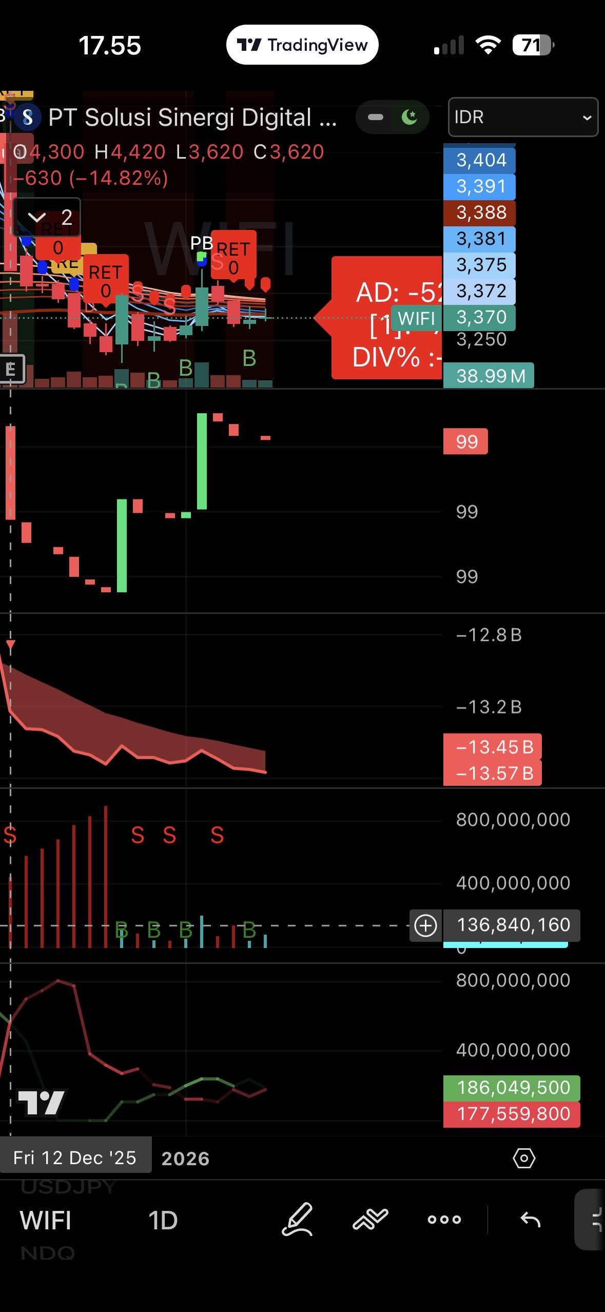 $WIFI, seminggu terakhir dominan seller, harga sideways tertahan di ma pantulannya, vpa masih merah, div merah, belum ada tanda tanda spesifik akan naik dalam waktu dekat.