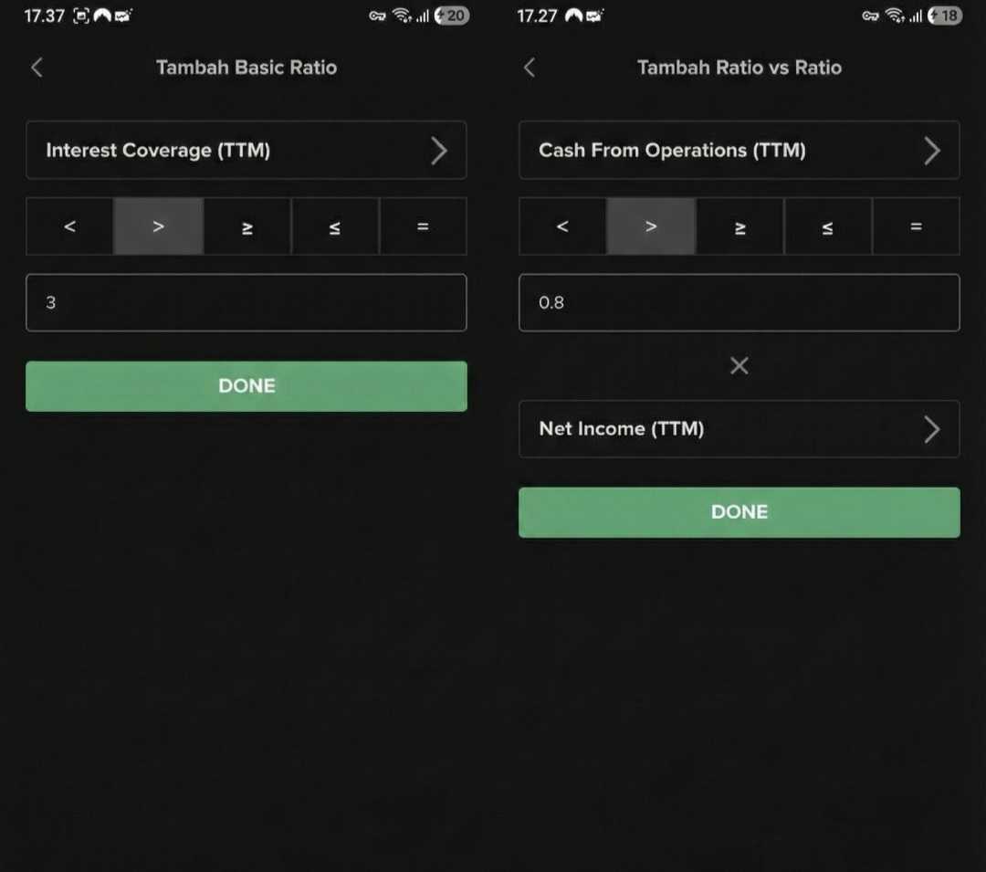 Screener pengguna belum memiliki filter solvabilitas (hutang). Meskipun pengguna mencari saham growth, hutang yang berlebihan di lingkungan suku bunga tinggi (seperti kondisi makroekonomi global saat ini) adl pembunuh valuasi. Alih' menggunakan Debt to Equity Ratio (DER) konvensional yg bisa bias pada sektor tertentu, kita akn menggunakan Debt Service Coverage Ratio proksi....