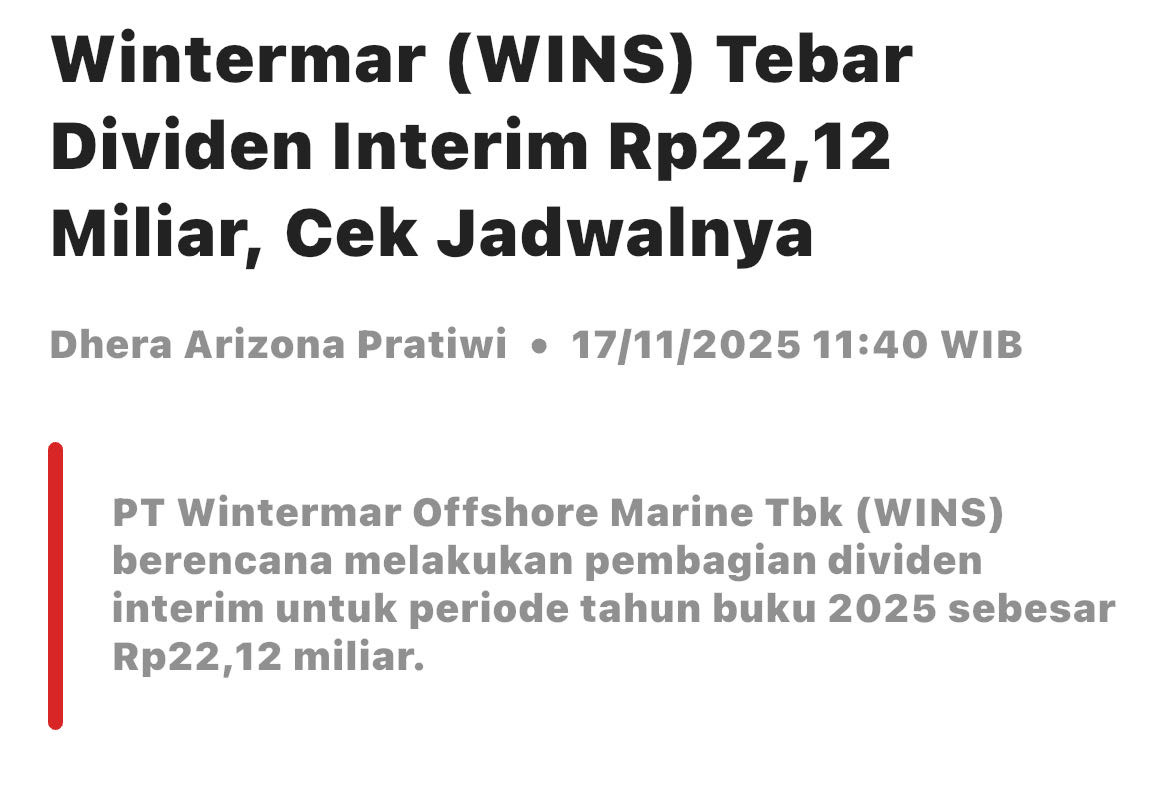 STOCKWATCH.ID (JAKARTA) โ PT Wintermar Offshore Marine Tbk (WINS) berencana membagikan dividen interim untuk tahun buku yang berakhir 31 Desember 2025 sebesar Rp22,12 miliar atau Rp5 per saham kepada pemegang sahamnya.