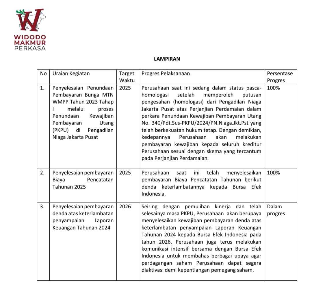 PT Widodo Makmur Perkasa Tbk (WMPP) menargetkan pendapatan tahun 2026 naik dua kali lipat dari 2025 melalui efisiensi operasional, peningkatan kapasitas produksi, dan dukungan permintaan daging nasional serta program pemerintah Makan Bergizi Gratis.