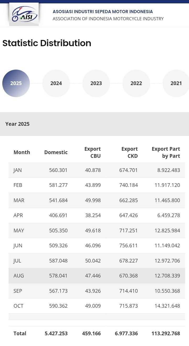 Rilis data penjualan (distribusi) sepeda motor di pasar domestik Indonesia Oktober 2025 oleh AISI