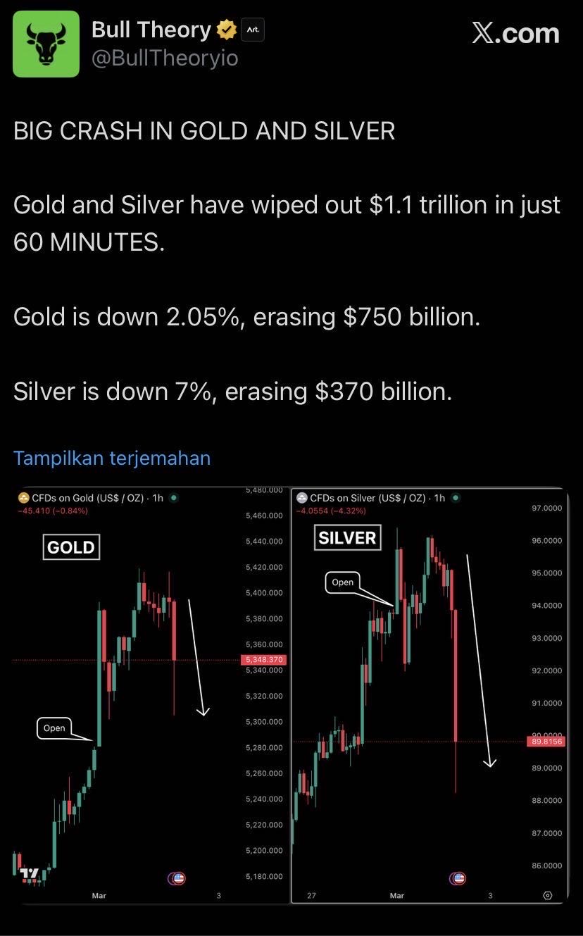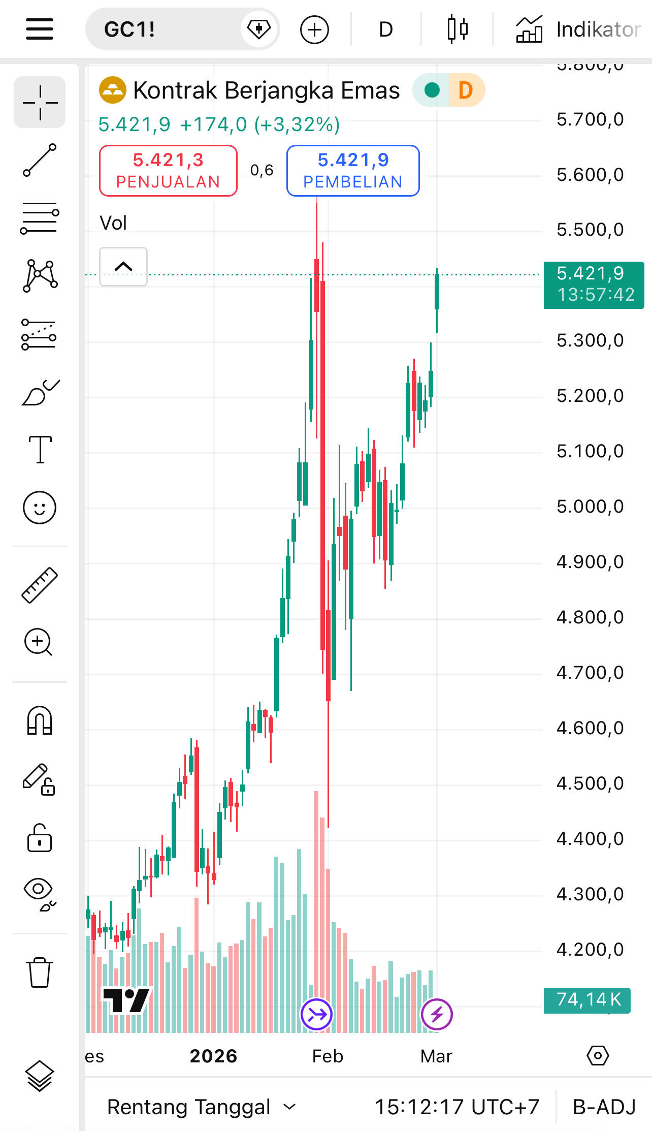 Ketegangan geopolitik biasanya mendorong arus dana ke aset safe–haven seperti emas. Emas spot sempat melonjak +2,7% pada Senin (2/3) ke level US$5.419/oz, sebelum melandai ke level US$5.398/oz (+2,25%) per Senin sore.