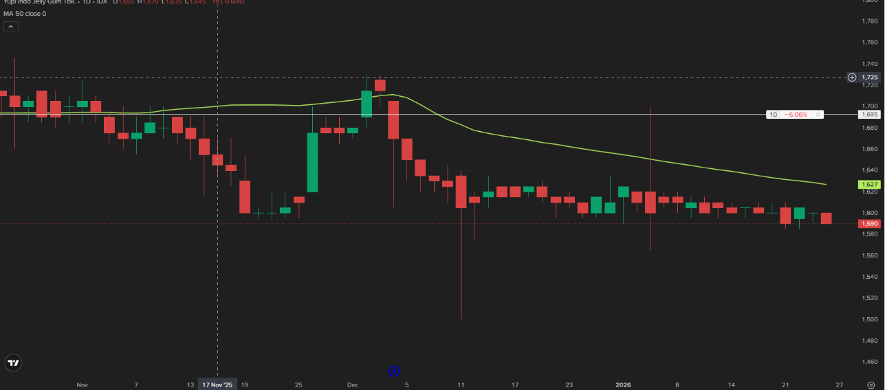 āPosisi Harga: Saat ini YUPI diperdagangkan di level 1.605, jauh di bawah harga perdana (IPO) mereka yang dipatok di Rp2.390 pada Maret 2025.