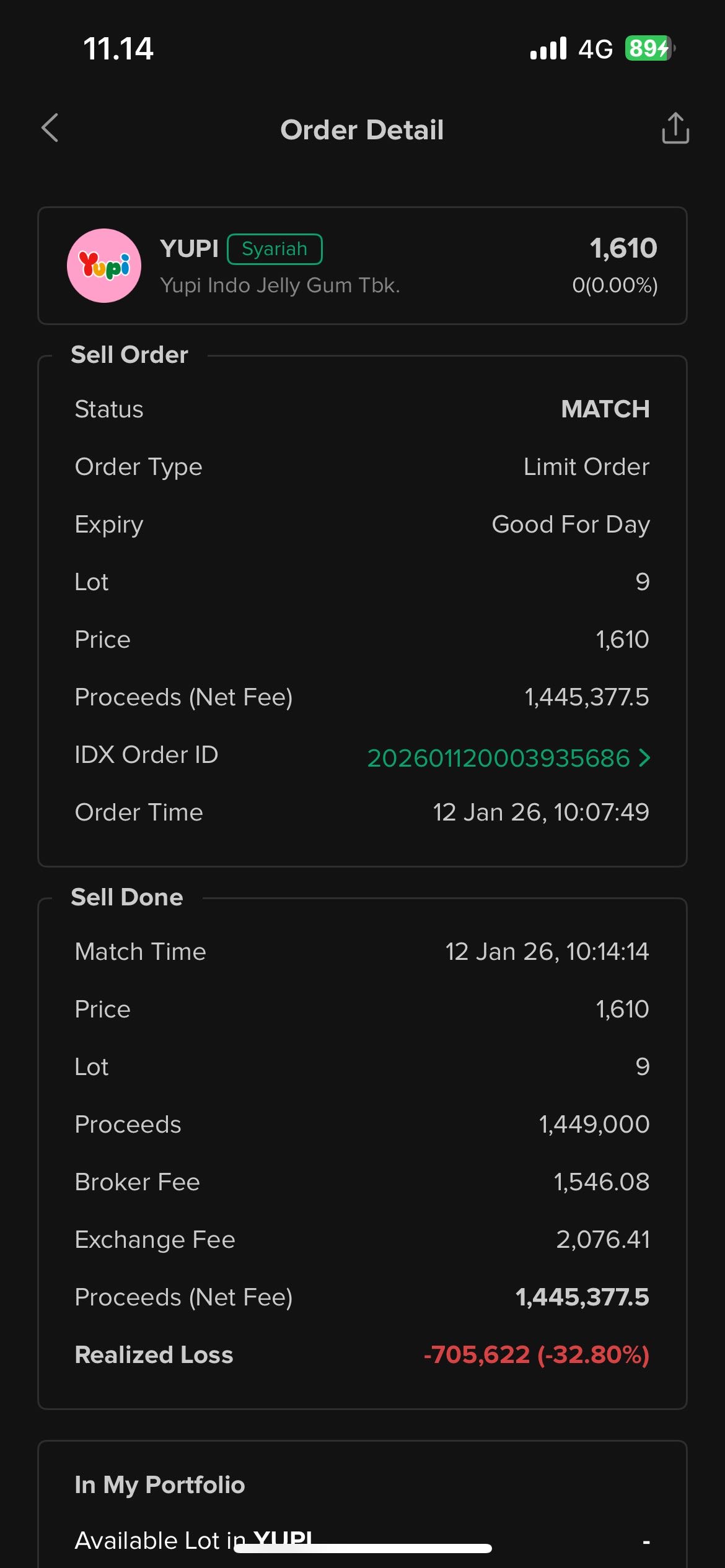 Posisi Harga: Saat ini YUPI diperdagangkan di level 1.605, jauh di bawah harga perdana (IPO) mereka yang dipatok di Rp2.390 pada Maret 2025.