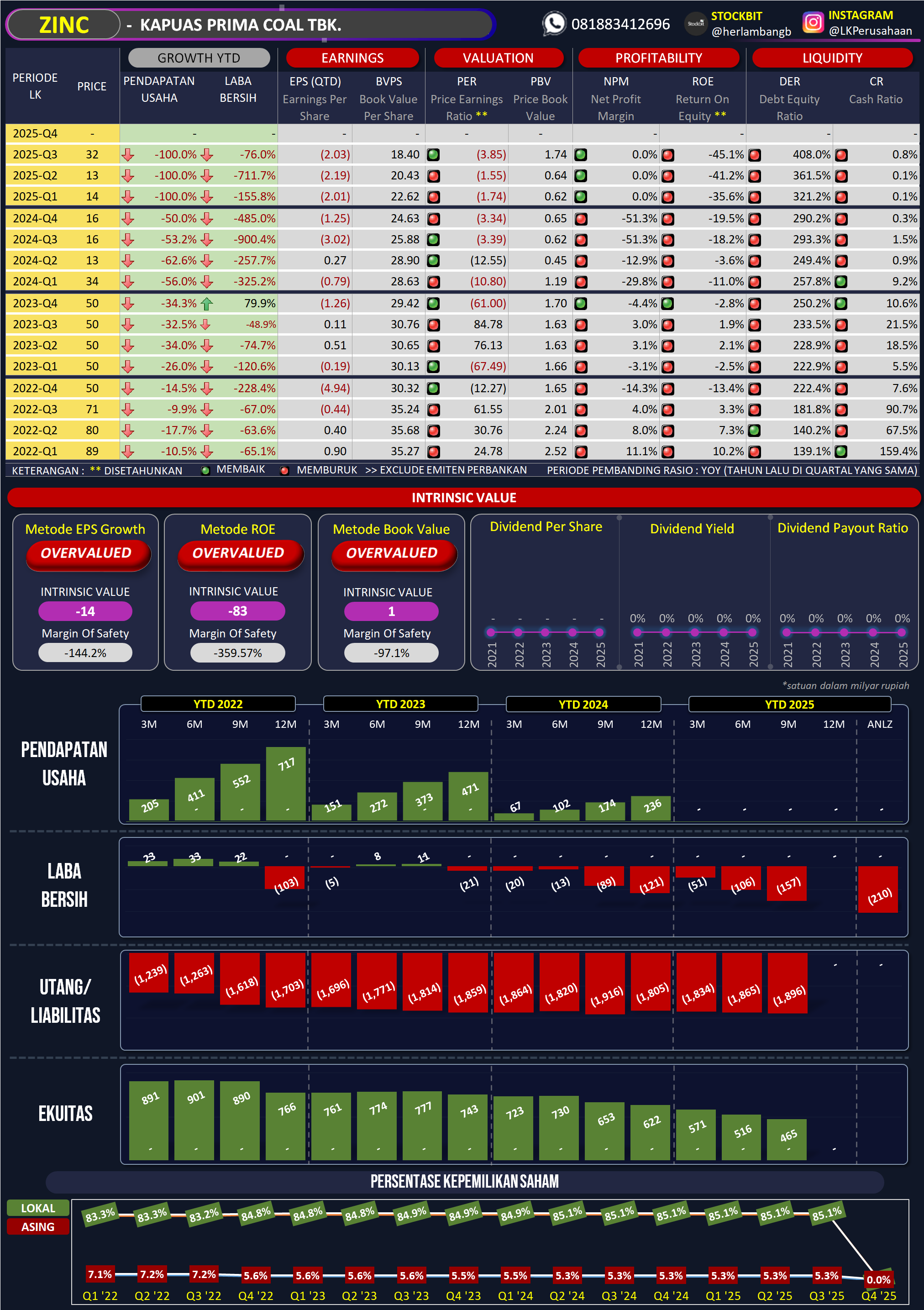 Konteks fundamental ZINC: saka data publik, perusahaan iki ngalami kesulitan kinerja. Contone: return on equity (ROE) negatif, perusahaan kadang rugi.
