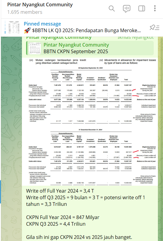 BBTN sudah kita bahas di postingan sebelumnya bahwa labanya naik karena pendapatan bunga naik cukup gila, tapi kegilaan itu tidak sampai mengantarkan laba ke orbit Mars karena CKPN juga ikut terbang. Banyak yang tepuk tangan dulu melihat NII naik besar, tapi begitu lihat bagian CKPN langsung naik juga tensinya. Maka kini pertanyaan pentingnya adalah, dari mana sumber risiko itu muncul. Jawabannya jelas dari kredit yang disalurkan BBTN. Kredit yang sehat akan jadi mesin laba, sedangkan kredit yang sakit akan jadi lubang biaya. Jadi kalau mau menilai apakah laba BBTN itu berkualitas atau cuma manis doang di permukaan, jawabannya ada di profil kredit. Upgrade Skill https://cutt.ly/Ve3nZHZf