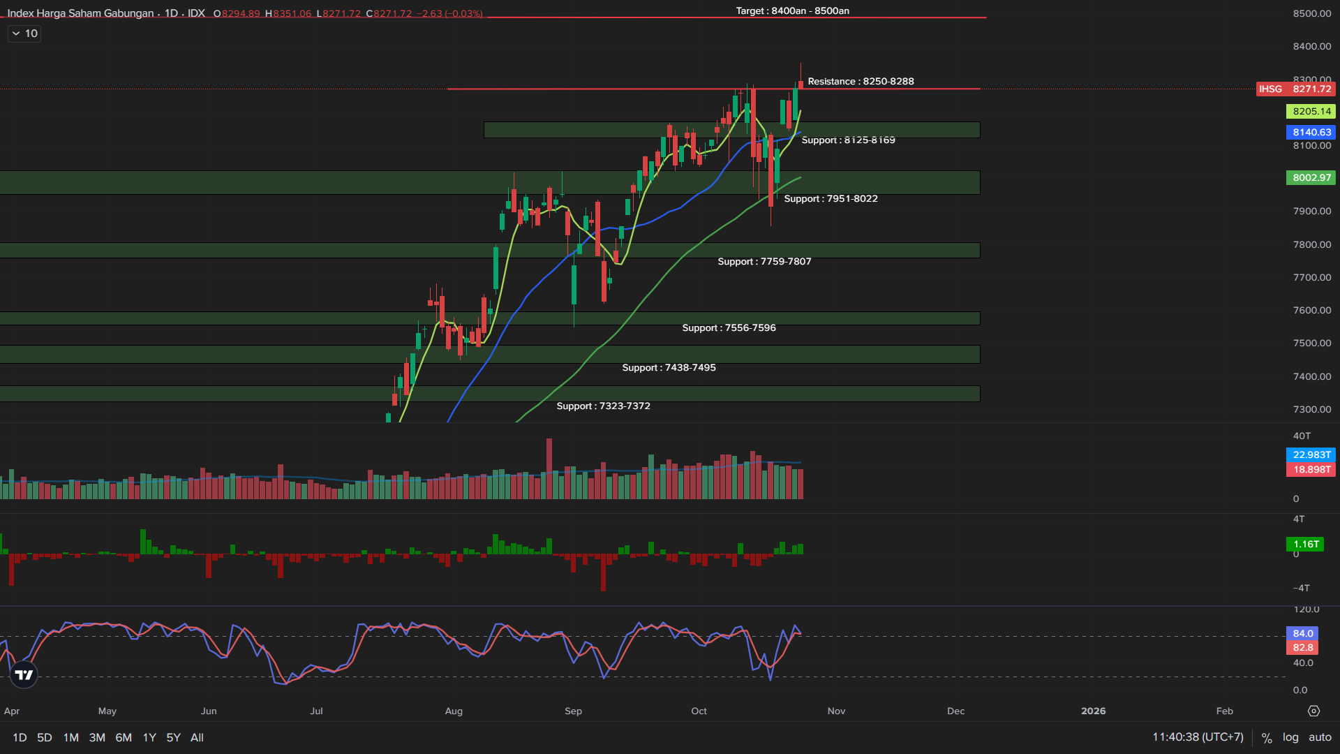 IHSG Terlihat dalam seminggu perdagangannya yang terakhir ini overall sudah berhasil untuk bisa rebound n naik dengan cukup signifikan n solid dengan disertai adanya Inflow Jumbo n Konsisten dari Pihak Foreign bahkan hingga di hari Jumat IHSG ini sempat menyentuh angka 8351 walaupun mmg akhirnya terlihat IHSG ini closenya hanya di 8271 dimana hal ini menunjukkan bahwa IHSG secara pergerakan masih tertahan oleh area Resistancenya yang ada diangka 8250-8288. Meski begitu, terlihat sebenarnya overall trend analysis n momentum dari IHSG ini masih Strong Bullish sekali hingga saat ini, lalu walaupun price action IHSG kita di hari Jumat lalu jelek, terlihat menariknya Pihak Foreign masih Inflow sekitar 1,16 T sehingga overall viewnya masih bagus n menarik IHSG kita ini.