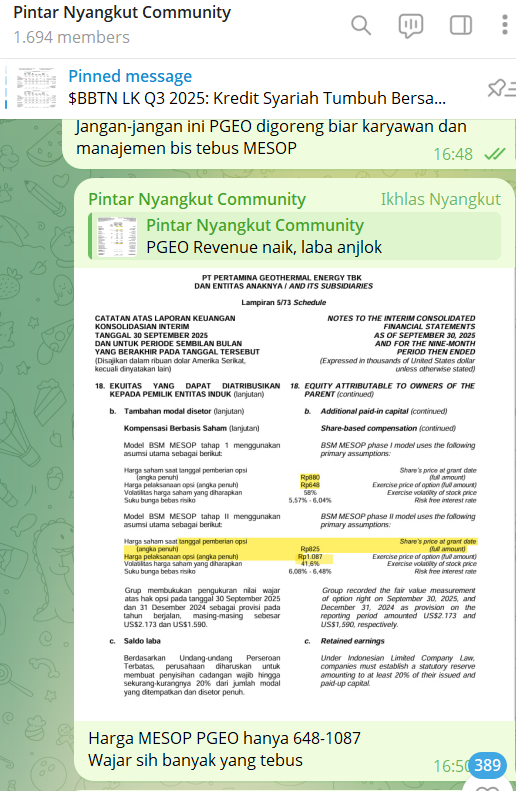 Harga saham PGEO saat ini 1.330 Rupiah. Sementara harga tebus opsi MESOP 648 Rupiah untuk Tahap I, juga 648 Rupiah untuk Tahap I.2, 1.087 Rupiah untuk Tahap II dan 838 Rupiah untuk Tahap III. Semua masih di bawah harga pasar sehingga semua opsi itu in the money. Artinya manajemen bisa tebus murah lalu dapat cuan seketika. Dan benar saja, pada jendela eksekusi 24 Agustus 2025 dieksekusi 14,65 juta saham Tahap I.1, 189,23 juta saham Tahap II dan 96,17 juta saham Tahap III. Totalnya 300,06 juta saham masuk pasar. Ini menambah saham beredar dan bikin tekanan teknikal. Maka pantas saja saham PGEO cenderung tidak melonjak seagresif BREN. Itu karyawan dan manajemen tebus MESOP di harga super diskon,.
