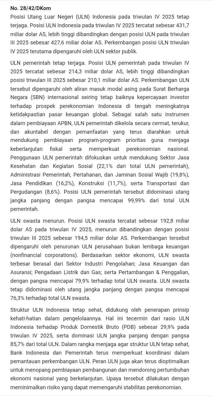 Rilis data utang luar negeri (ULN) Indonesia Q4 2025 oleh BI