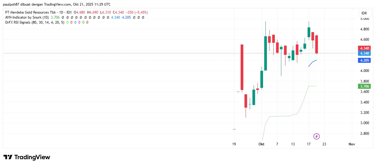 Harga terakhir 4340, turun -5.45%. Range harian 4310 - 4690.