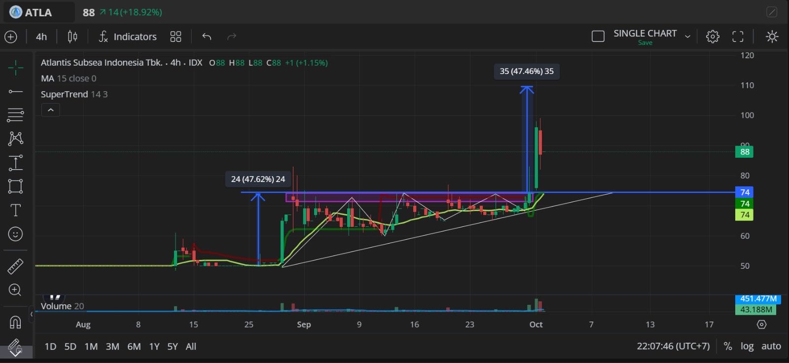 Jadi ATLA ini udah retest di area demand kuatnya sampe 3x, yaa kurang lebih gambarnya seperti itu, dan secara garis trendlinenya dia sangat” bagus, dan hari yang dinantikan adalah hari ini, ternyata dia valid breakout karena volume besar waktu opening sehingga bisa sentuh angka 99