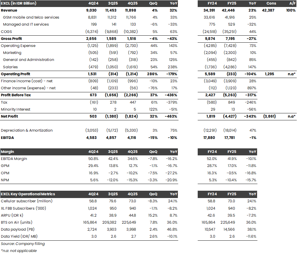 Meningkatnya kerugian pada 4Q25 disebabkan oleh kenaikan beban pokok pendapatan (+63% YoY, +5% QoQ) dan opex (+143% YoY, +44% QoQ), yang utamanya didorong oleh kenaikan biaya integrasi (+146% QoQ) dan beban percepatan depresiasi (+6% QoQ) pasca–merger. Realisasi beban integrasi selama 2025 tercatat sebesar ~Rp2,4 T, lebih tinggi dibandingkan estimasi manajemen EXCL pada earnings call 9M25 di level Rp1,5 triliun. Namun, manajemen juga merevisi turun estimasi beban integrasi untuk 2026, dari sekitar Rp1,5 T menjadi lebih rendah dari Rp1 T. Sementara itu, beban percepatan depresiasi diestimasikan naik ke ~Rp5 T untuk 2026 (vs. beban percepatan depresiasi 2025: ~Rp4,5 T). Manajemen menjelaskan bahwa kedua biaya tersebut akan terus berlanjut hingga proses integrasi selesai, yang diperkirakan memakan waktu sekitar 2 tahun sejak merger efektif dilakukan pada April 2025. Namun, porsi pembukuan biaya tersebut diperkirakan akan mulai menurun pada 2H26, karena sebagian besar biaya akan dibukukan pada 1H26.