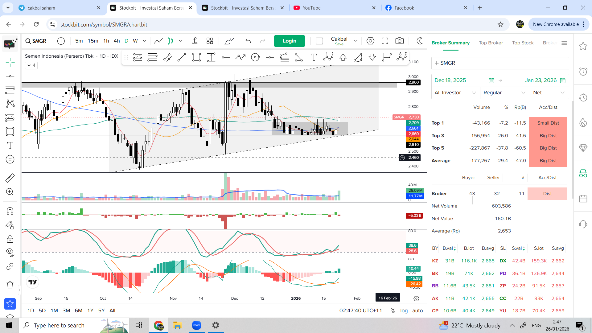 Secara teknikal cukup menarik sudah berhasil breakout dari kotak sideways diarea harga 2700-2600 dari Desember 2025 dan closing diatas MA 5, 20, 50, dan 200 diatas harga 2700 yang sekarang menjadi area support. Indikator Stochastic dan MACD juga masih menunjukan sinyal buy hingga saat ini. Secara broker summary jika ditarik dari tanggal 18 Desember 2025 hingga tanggal 23 Januari 2026 terlihat KZ, BK, AK, CP memiliki barang sejumlah 70an miliar diharga rata-rata 2653. Jika dihitung dari harga rata-rata dari 18 Desember 2025 ke harga terkahir penutupan perdagangan minggu lalu tanggal 23 Januari 2026, maka didapatkan jumlah kenaikan sebesar 3% dari harga rata-rata yang dimiliki broker asing tersebut. Kedepannya akan sangat menarik jika harga berhasil bertahan diatas area 2650-2600