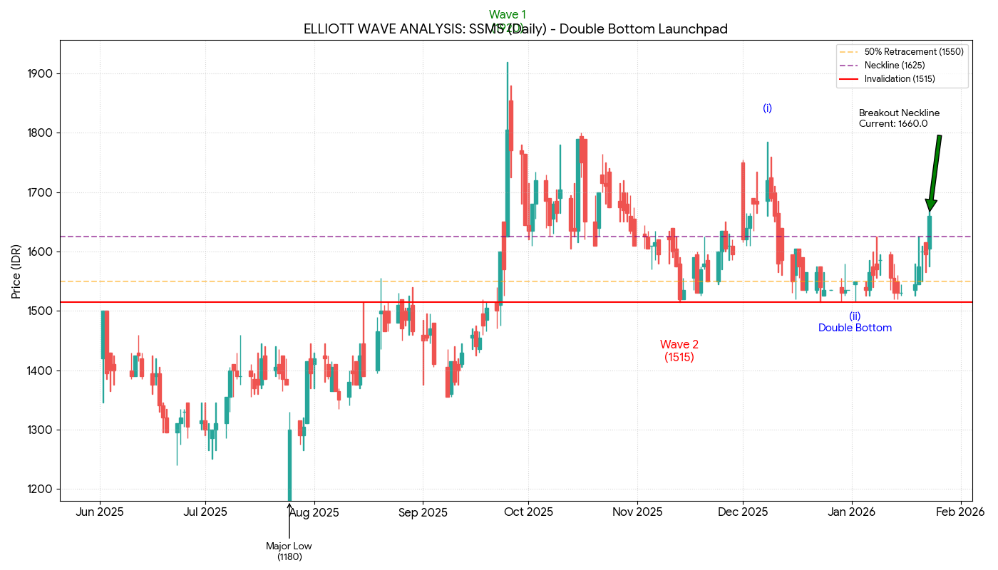 Posisi Saat Ini: Harga baru saja menembus (breakout) area resisten/neckline 1625 dan ditutup kuat di 1660. Pola ini mengkonfirmasi Double Bottom pada akhir koreksi.